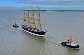 After three years of restoration at the Peters Werft in Wewelsfleth our tugs TAUCHER O. WULF 3 and WULF 5 tow the traditional sailing vessel PEKING to Hamburg today. The voyage started at 06:30 in Wewelsfleth and - after a tidal required stopover at Twielenfleth roads - the PEKING should arrive her final berth at the Hansahafen at approx. 19:00.