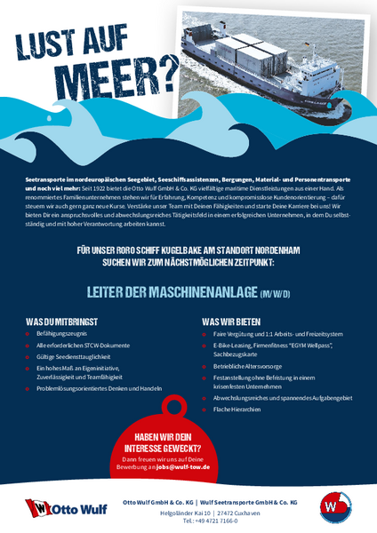 Seetransporte im nordeuropäischen Seegebiet, Seeschiffsassistenzen, Bergungen, Material- und Personentransporte und noch viel mehr: Seit 1922 bietet die Otto Wulf GmbH & Co. KG vielfältige maritime Dienstleistungen aus einer Hand. Als renommiertes Familienunternehmen stehen wir für Erfahrung, Kompetenz und kompromisslose Kundenorientierung – dafür steuern wir auch gern ganz neue Kurse. Verstärke unser Team mit Deinen Fähigkeiten und starte Deine Karriere bei uns! Wir bieten Dir ein anspruchsvolles und abwechslungsreiches Tätigkeitsfeld in einem erfolgreichen Unternehmen, in dem Du selbstständig und mit hoher Verantwortung arbeiten kannst.